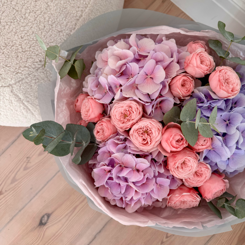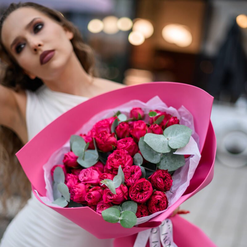 od 220 złGałązkowe piwoniowe róże z eukaliptusem