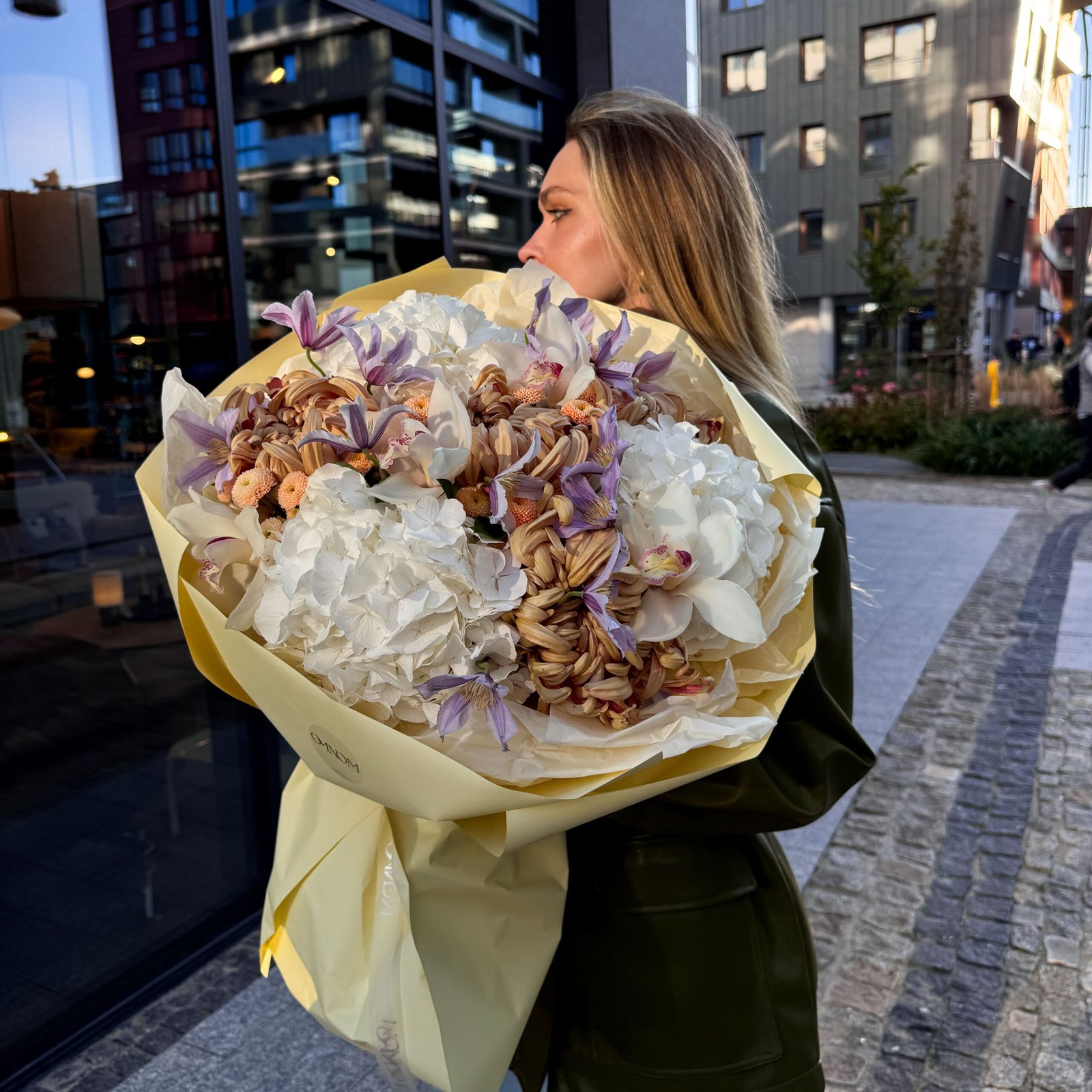 A subtle yet characterful bouquet in natural autumnal tones. The white hydrangea adds lightness and volume, the delicate clematis introduces a touch of romance and the brown chrysanthemums add depth and warmth. The white cymbidium emphasises the elegance of the composition, creating a sophisticated harmony of colours and forms. This is a bouquet with soul - ideal for lovers of nature, autumnal subtlety and timeless beauty.