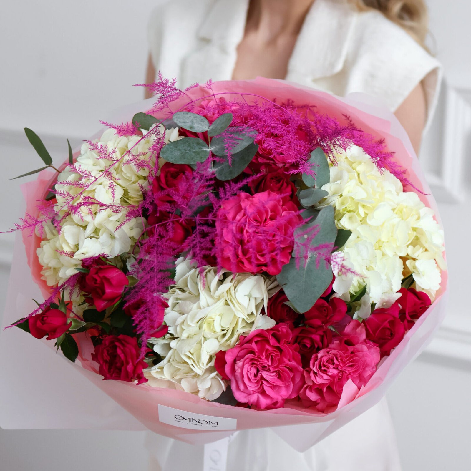 Efektowna i bardzo nowoczesna kompozycja utrzymana w intensywnych odcieniach malinowego różu przełamanych czystą bielą. Malinowe róże piwoniowe nadają bukietowi luksusowy, pełny charakter i wyrazistą formę, natomiast malinowe róże gałązkowe wprowadzają lekkość oraz naturalną dynamikę. Biała hortensja buduje objętość i eleganckie tło dla mocniejszej kolorystyki, malinowy asparagus dodaje dekoracyjnej finezji i współczesnego akcentu, a eukaliptus subtelnie równoważy całość świeżą zielenią. Bukiet prezentuje się niezwykle stylowo i przyciąga uwagę swoją strukturą oraz odważną kolorystyką — idealny na wyjątkowe okazje i jako spektakularny prezent bez okazji.