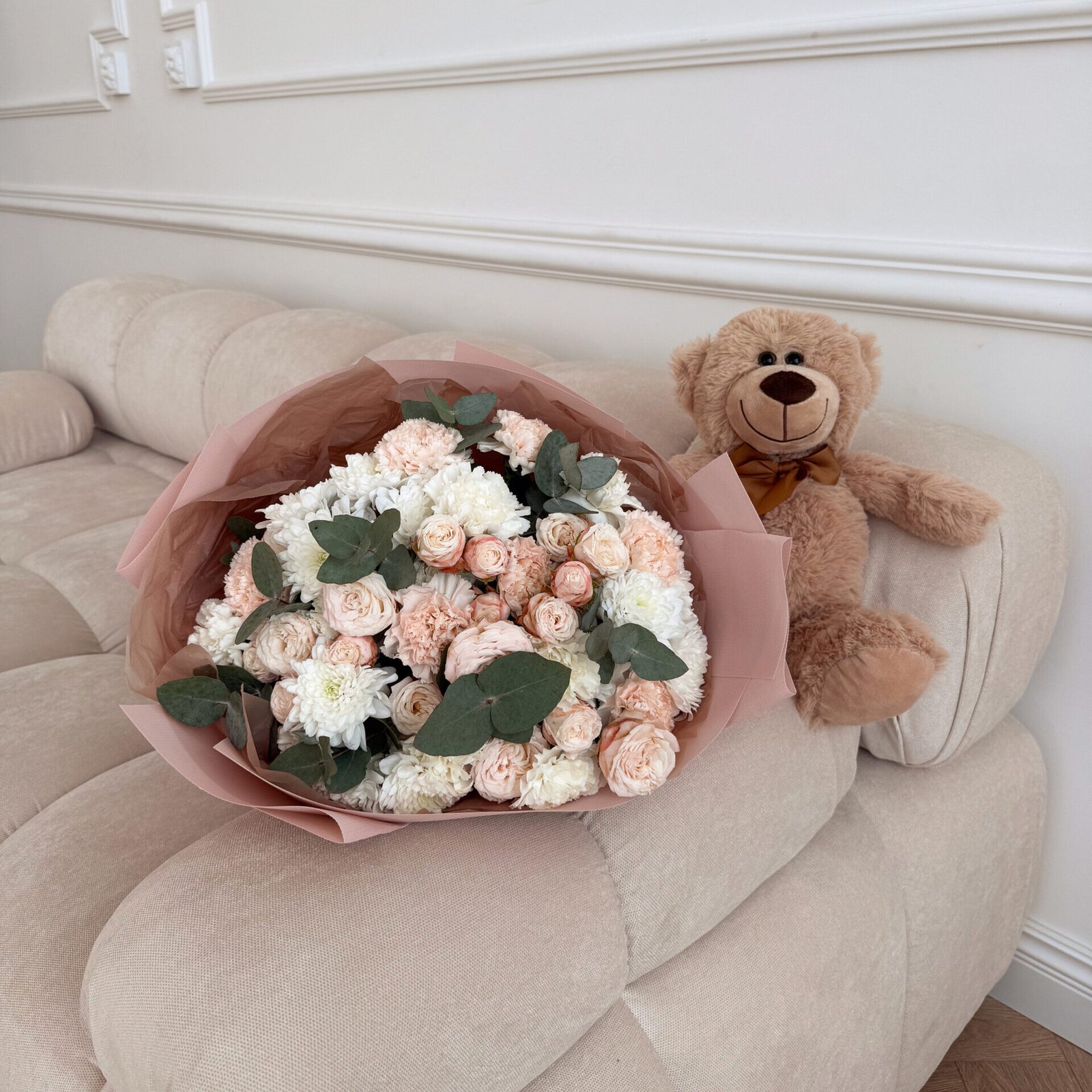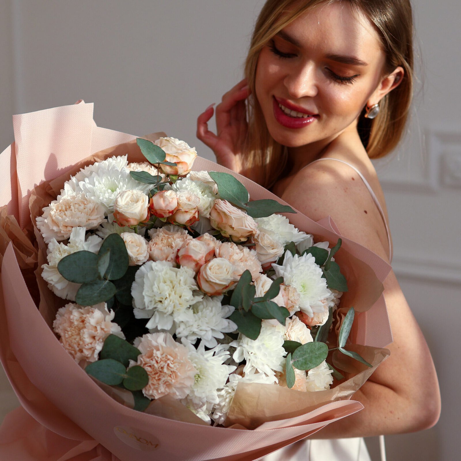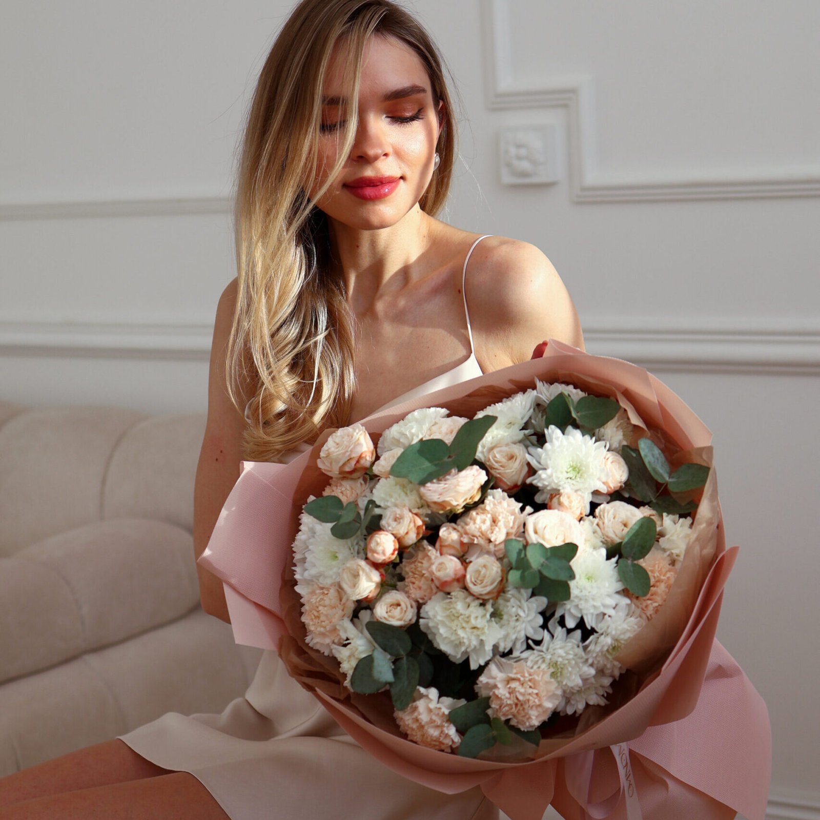 Subtelna, harmonijna kompozycja utrzymana w eleganckiej palecie bieli, kremu i delikatnej brzoskwini. Białe chryzantemy nadają bukietowi objętości i czystości formy, tworząc jasną, świeżą bazę kompozycji. Kremowe róże gałązkowe wprowadzają romantyczną miękkość i lekkość, a jasne goździki dodają delikatnej tekstury oraz naturalnego uroku. Całość dopełnia eukaliptus, który podkreśla nowoczesny charakter bukietu i nadaje mu świeżości oraz eleganckiego wykończenia. To propozycja idealna na wyjątkowe okazje, subtelny prezent lub stylowy gest pełen klasy.