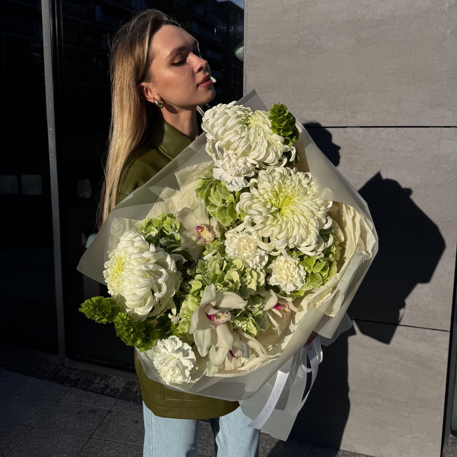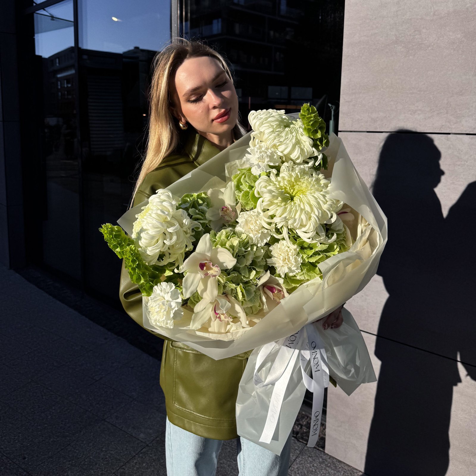 Elegancki i świeży bukiet w odcieniach bieli i zieleni. Delikatne białe chryzantemy symbolizują czystość i spokój, a zielone hortensje nadają kompozycji lekkości i naturalnego uroku. Kwiaty cymbidium dodają całości wyrafinowania i subtelnego, egzotycznego akcentu. To bukiet pełen harmonii i klasy — idealny wybór na elegancki prezent, ślub lub wyjątkową, uroczystą okazję.