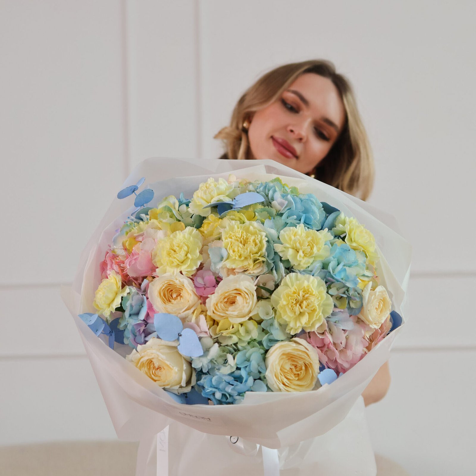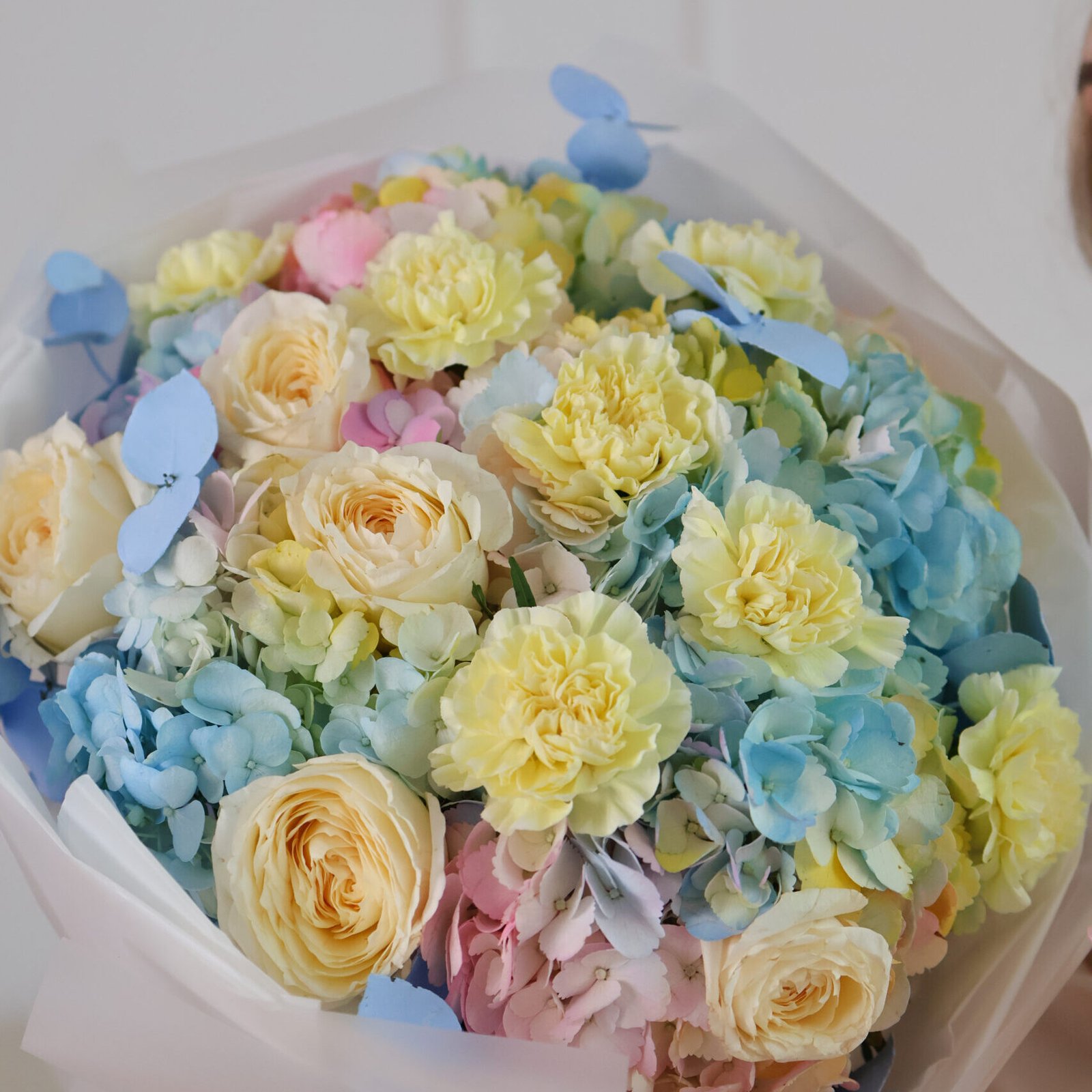 Połączenie ciepła i chłodu w jednej, niezwykle stylowej kompozycji. Piwoniowe róże w odcieniu słonecznej żółci przyciągają wzrok swoim królewskim wyglądem, podczas gdy żółte goździki dodają całości finezji. Hortensje, niczym puszyste obłoki, wypełniają przestrzeń między kwiatami, a gałązki niebieskiego eukaliptusa wprowadzają elegancki, chłodny kontrast. To bukiet dla osób, które cenią odważne, przemyślane połączenia i nowoczesny styl.