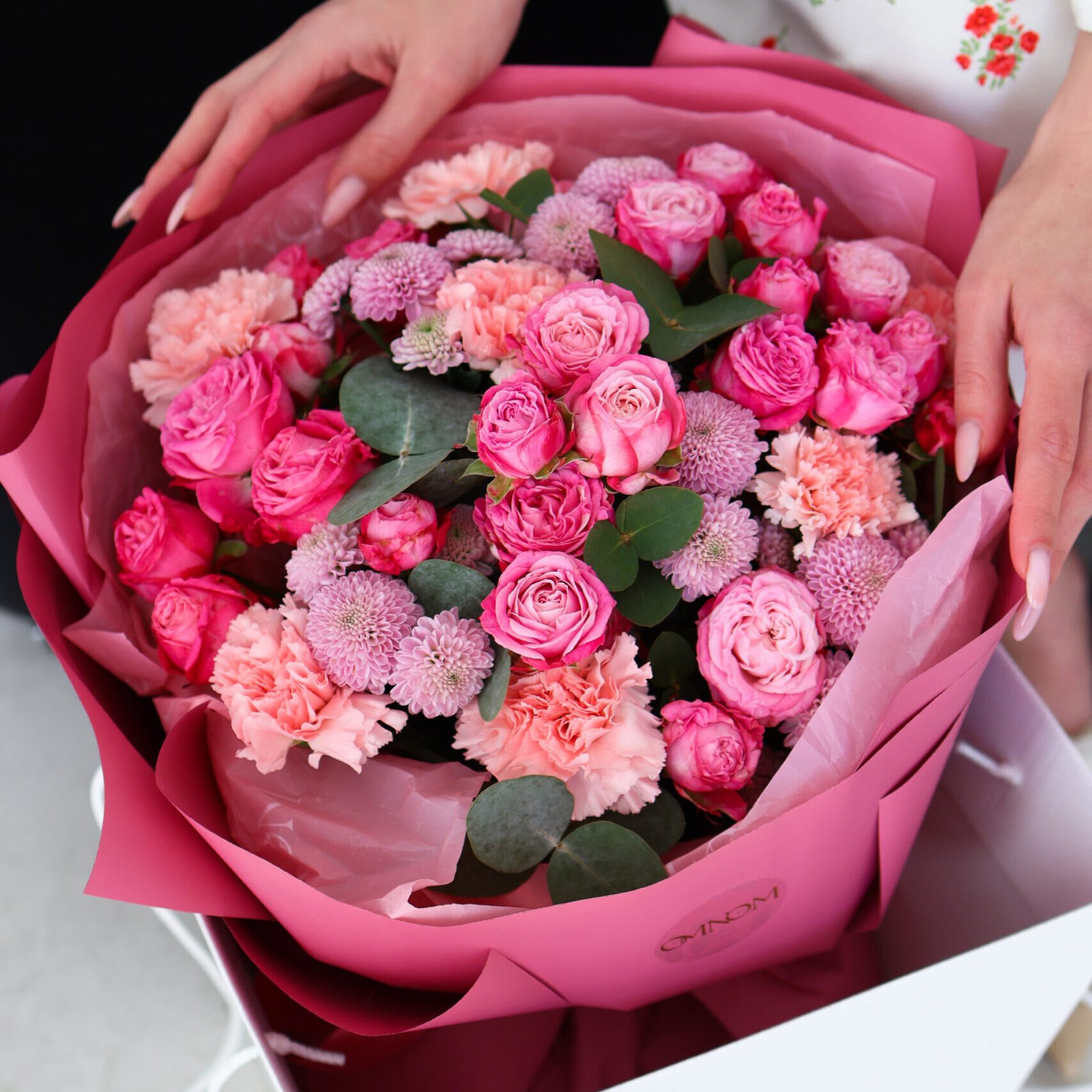 Bogata, a jednocześnie harmonijna kompozycja utrzymana w odcieniach intensywnego różu, pudrowego różu i delikatnego fioletu. Różowe róże gałązkowe nadają bukietowi romantycznej miękkości i naturalnej lekkości, goździki wprowadzają subtelną fakturę oraz objętość, a chryzantema gałązkowa buduje dekoracyjną, pełną formę. Całość dopełniają gałązki eukaliptusa, które wprowadzają świeżość, lekkość i nowoczesny akcent, podkreślając elegancki charakter bukietu. To propozycja idealna na urodziny, rocznice, podziękowania lub wyjątkowy prezent bez okazji.