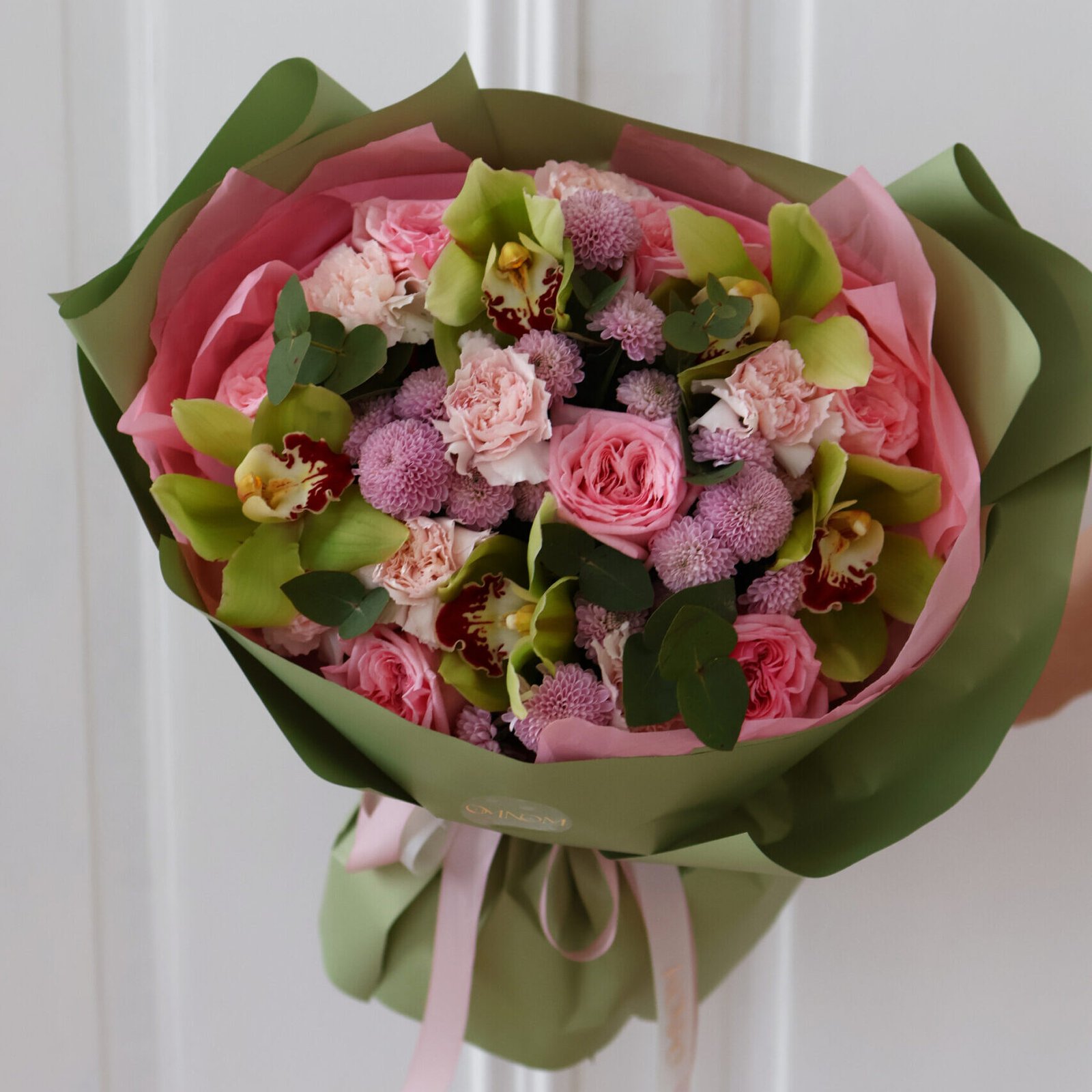 Elegancka, wielokwiatowa kompozycja utrzymana w harmonijnych odcieniach różu i zieleni. Różowe róże stanowią bazę bukietu, nadając mu klasyczny i romantyczny charakter. Storczyki cymbidium wprowadzają egzotyczny akcent i wyrazistą formę, która przyciąga uwagę. Goździki oraz chryzantemy dodają objętości i miękkości, tworząc spójną, bogatą strukturę kompozycji. Całość uzupełnia świeży eukaliptus, który nadaje bukietowi lekkości oraz naturalnego, nowoczesnego wykończenia. Bukiet prezentuje się bardzo stylowo i efektownie — doskonały na wyjątkowe okazje, elegancki prezent lub jako estetyczny akcent bez okazji.