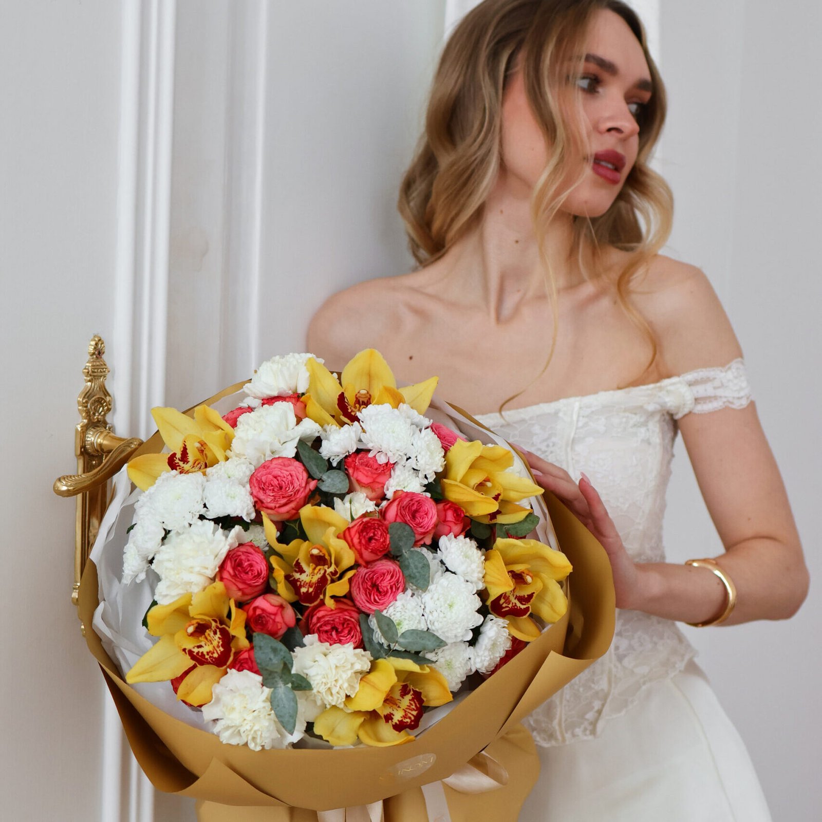 Wyrazista i elegancka kompozycja oparta na kontrastowym połączeniu ciepłej żółci, malinowego różu i czystej bieli. Żółte storczyki cymbidium nadają bukietowi luksusowego charakteru i przyciągają uwagę intensywnym kolorem oraz egzotyczną formą. Malinowe róże piwoniowe budują głębię i romantyczną strukturę kompozycji, pięknie kontrastując z jasnymi tonami. Białe chryzantemy i goździki wprowadzają harmonię, objętość oraz świeżość, nadając całości lekkości i eleganckiego wykończenia. Eukaliptus stanowi naturalny akcent, który subtelnie równoważy intensywność barw. Bukiet prezentuje się bardzo efektownie i nowocześnie — idealny jako elegancki prezent, wyjątkowy gest lub dekoracyjny akcent na ważne okazje.