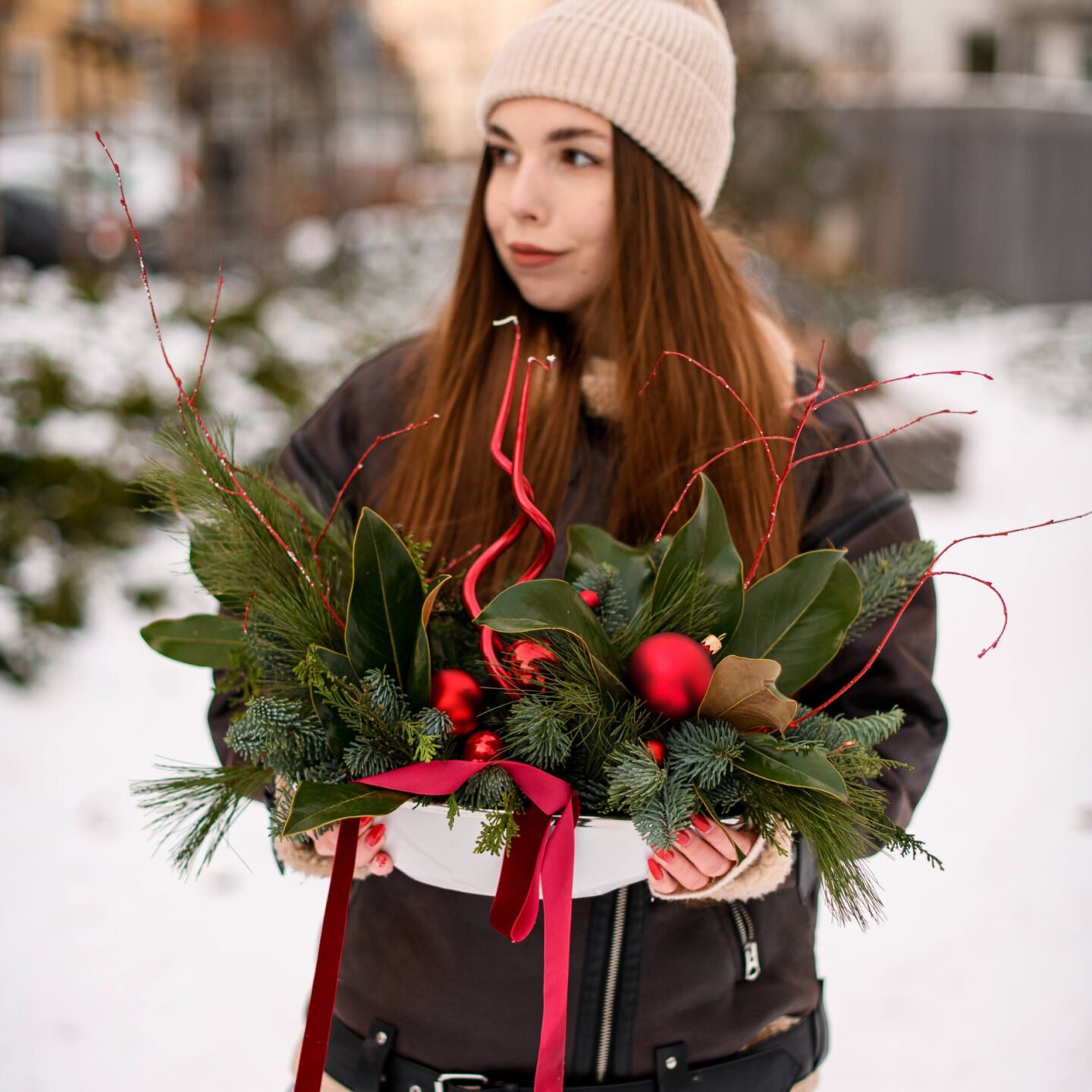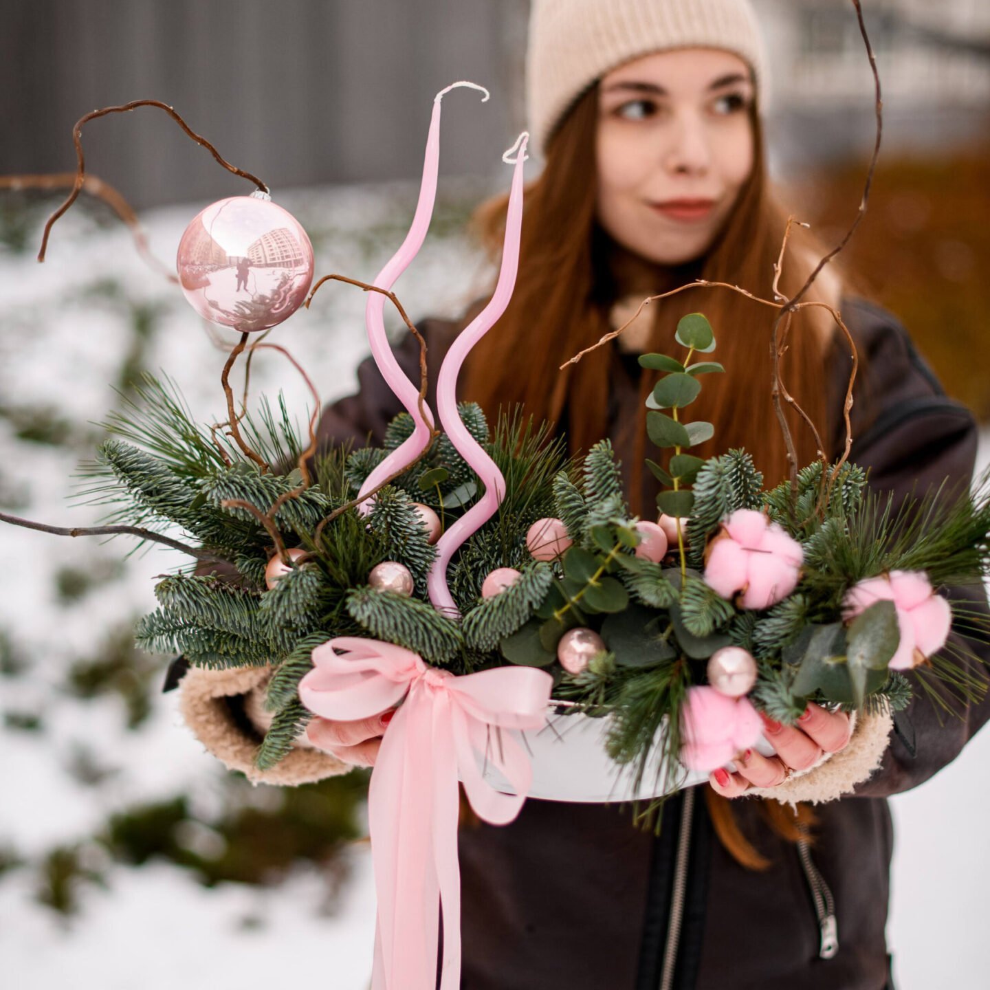 Zimowa kompozycja w ceramicznej osłonce to połączenie elegancji i naturalnego uroku, które doskonale pasuje do świątecznego wystroju wnętrz. Wykonana z gałęzi świerku nobilis, magnolii, bawełnianych kwiatów i akcentów ilexu, kompozycja przyciąga uwagę swoim ciepłym, świątecznym charakterem. Wersja w różowym kolorze wyróżnia się subtelnymi odcieniami pastelowego różu, które nadają całości delikatności i romantyzmu, podczas gdy wersja w czerwonym kolorze wprowadza dynamiczną, pełną energii atmosferę świąt.