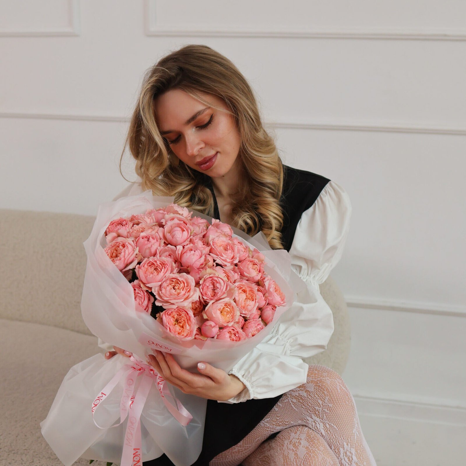 Этот исключительный монобукет составлен из кустовой пионовидной розы 'Джульетта’, считающейся одной из самых красивых и романтичных роз в мире. Ее объемные, полные цветы напоминают нежные английские пионы - слой за слоем кремово-персиковые лепестки расположены в идеальной, слегка вздернутой форме. Это цветы необыкновенного очарования: пушистые и воздушные, с одной стороны, и полные благородства и чувственного изящества - с другой. Нежный, сладкий аромат ванили и сирени обволакивает чувства, создавая атмосферу чистой романтики.