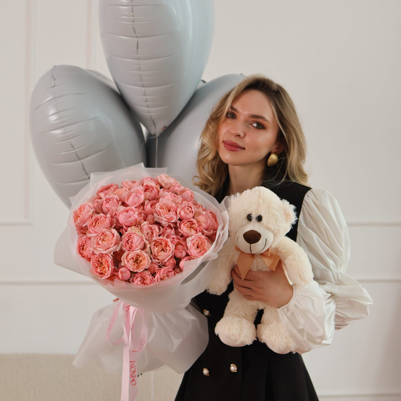 На фото композиция из 20 штук с плюшевым мишкой и воздушными шарами