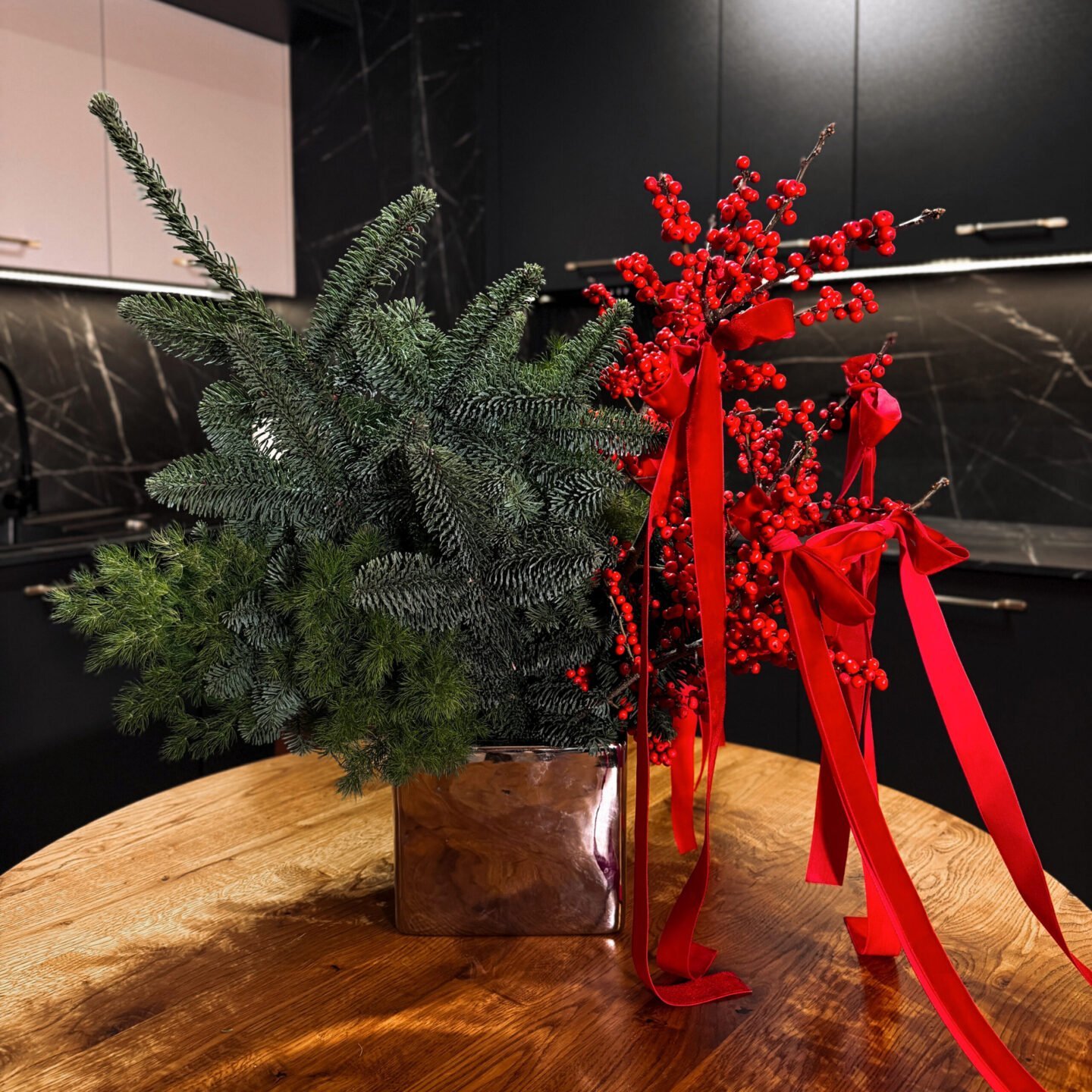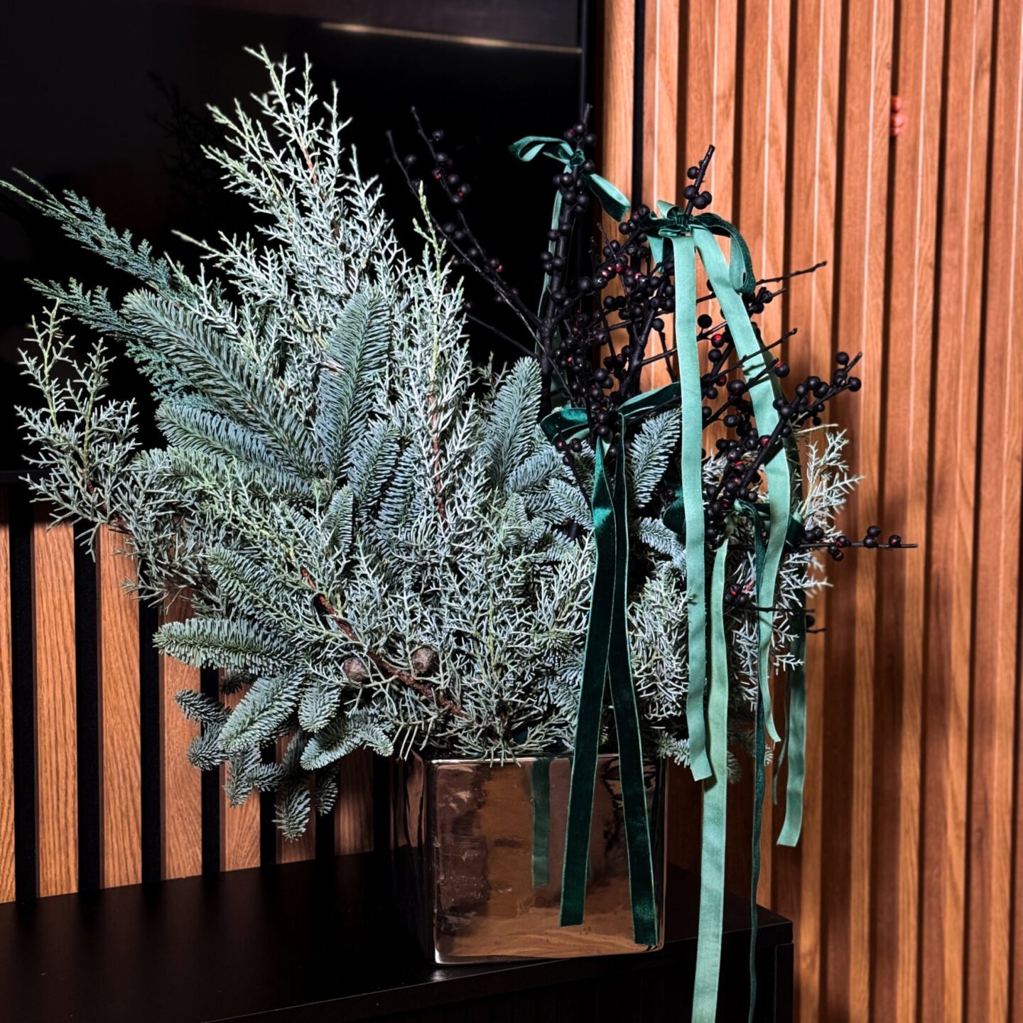 Эта элегантная рождественская композиция состоит из зеленых хвойных веток и иллекса, которые чудесно подчеркивают праздничное настроение. В зависимости от варианта исполнения, украшение может быть дополнено акцентными лентами насыщенного красного или глубокого темно-зеленого оттенка, которые придают утонченную элегантность и гармонируют с природными элементами. Все изделие помещено в зеркальную керамическую квадратную крышку, которая придает ему современный вид. Декор прекрасно сочетается с любым интерьером, создавая теплую и стильную рождественскую атмосферу.