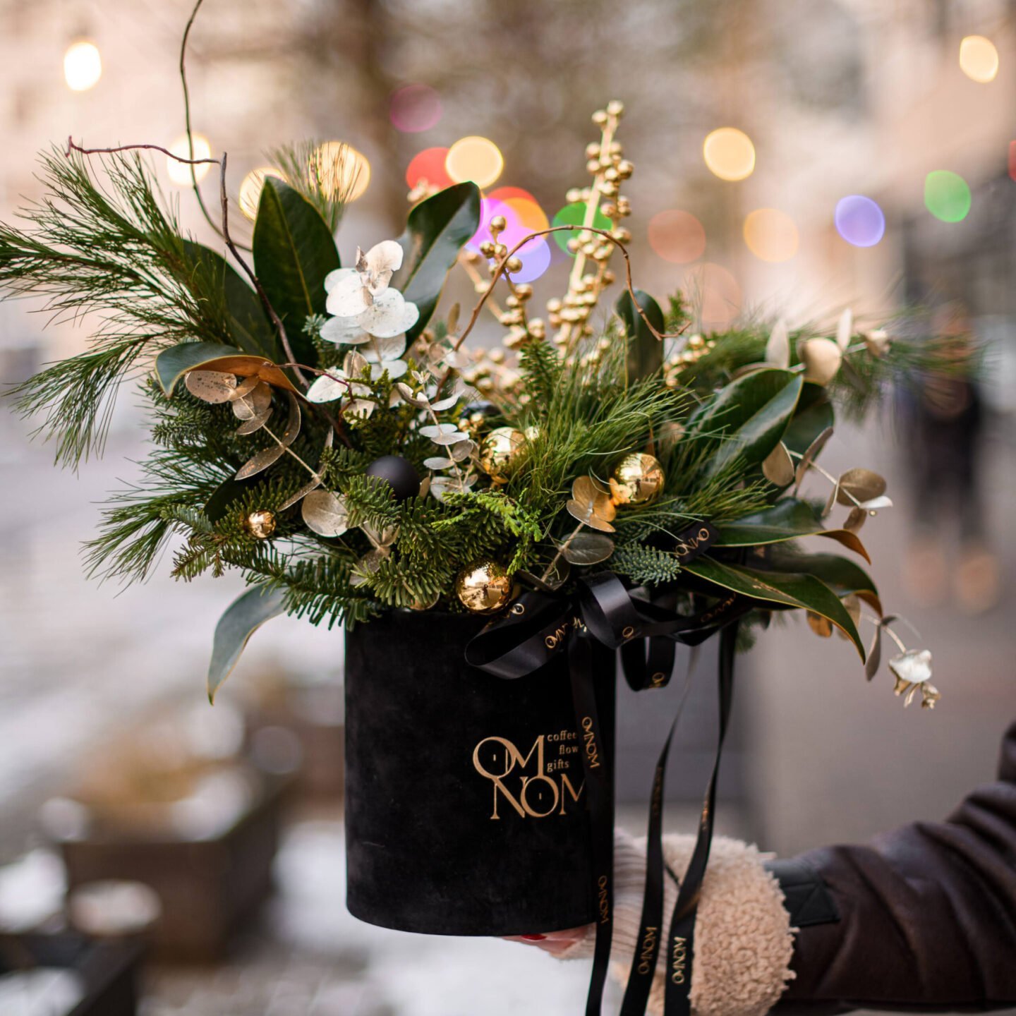 Зимова композиція в елегантних чорно-золотих тонах, розміщена в стильній квітковій коробці, - це поєднання сучасної елегантності та різдвяної магії. Гілки ялини нобіліс контрастують з тонкими золотистими акцентами - декоративними кульками, блискучим листям магнолії та іскристими гілками ілексу, які надають композиції розкішного та вишуканого відтінку. Чорні елементи, такі як декоративні гілочки та деталі квіткової коробки, додають композиції глибини та елегантності. Ця зимова композиція - ідеальний вибір для тих, хто хоче створити унікальний, стильний різдвяний декор.